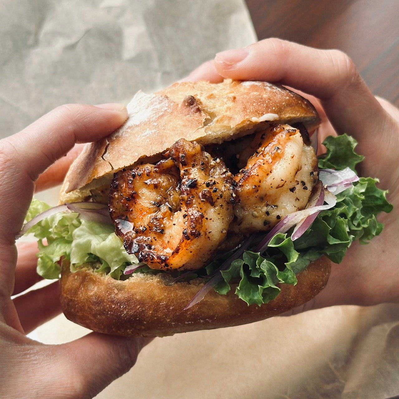 プリップリのエビを有機にんにく、オリーブオイルなどでマリネして自家製のエビオイル、バターで炒めオールスパイスで仕上げています!香りとピリップリッとした食感にエビの味わいもプラスされた美味しいサンドウィッチです。他、刻んだレタス、オニオンスライス、パンにはガーリックマヨネーズが塗ってあります!お店では冬のマンスリーサンドでとても人気のあるサンドウィッチです!